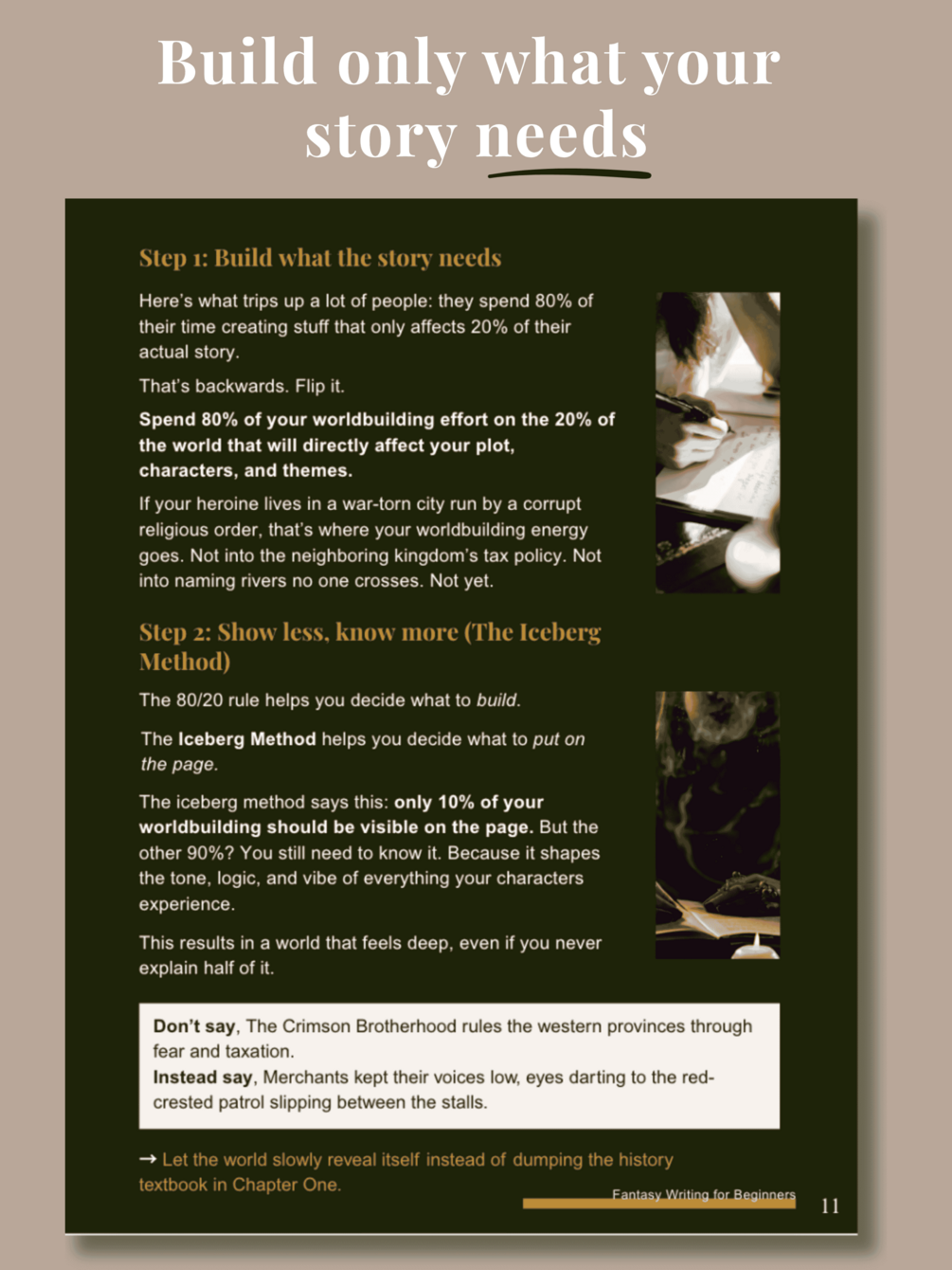 - Strategic Worldbuilding → Build immersive worlds without getting lost in endless details (includes the 80/20 rule and Iceberg Method)