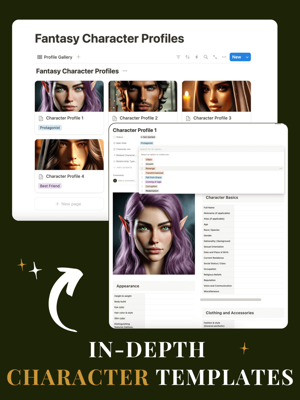 You’ll get a fully customizable Notion workspace designed to help you plan your fantasy world, develop unforgettable characters, structure your plot, build a magic system, and track your writing—all in one organized, digital toolkit