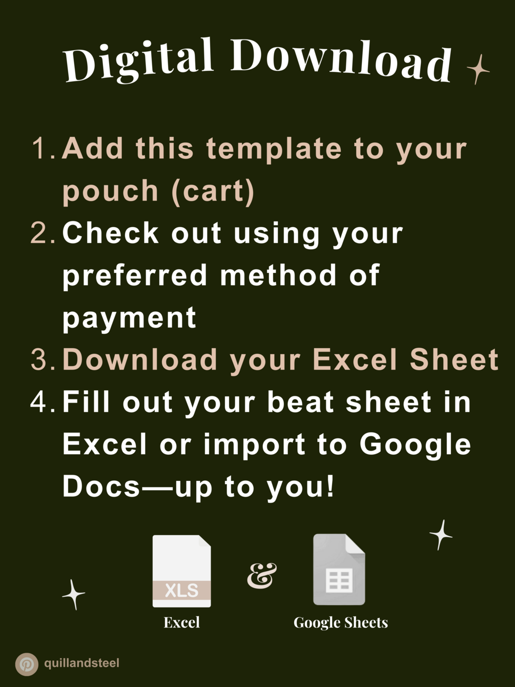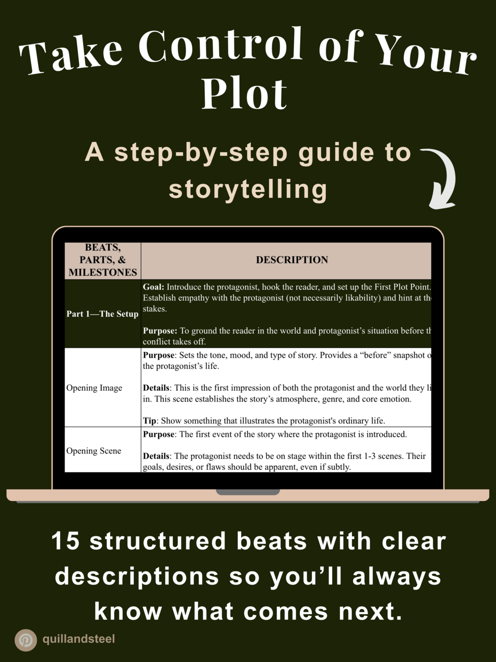 You’ll get a flexible story framework in Google Sheets and Excel, with 15 key beats, fantasy examples, and guided space to map out your plot from start to finish.